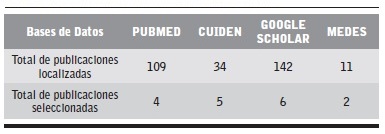 La búsqueda de la bibliografía seleccionada se realizó a través diversas bases de datos con el objetivo de recopilar la mayor producción científica posible disponible en relación con el objeto a estudio. Como determinante, se estableció la selección de artículos publicados en los últimos 5 años (periodo comprendido entre 2013 y 2018). El periodo de búsqueda bibliográfica fue establecido desde Marzo hasta Junio de 2018. Las bases de datos empleadas fueron: Pubmed, Cuiden, Google académico y Medes.