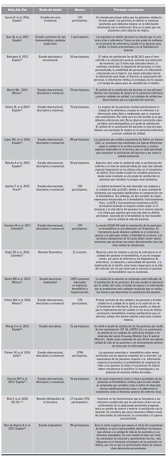 Conclusiones: Los factores más influyentes en la satisfacción del paciente en diálisis son, principalmente, la confianza transmitida y disposición del personal sanitario, trato personalizado, amabilidad y seguridad transmitida, la destreza para puncionar, entre otros. Respecto a los instrumentos de medida, no existe un instrumento de medida específico, para evaluar la satisfacción del paciente en diálisis. Los atributos más satisfactorios que destacan en la enfermería, son amabilidad, disposición e interés, preparación técnica profesional, trato personalizado, confianza y seguridad clínica.