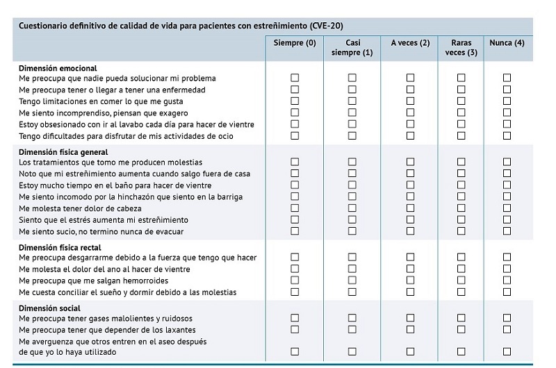 Perona M, Mearin F, Guilera M, Mínguez M, Ortiz V et al. Cuestionario específico de calidad de vida para pacientes con estreñimiento: desarrollo y validación del CVE-20. Med Clin (Internet). 2008 (consultado 16 Feb 2023);131(10):371-7. Disponible en: https://www.elsevier.es/es-revista-medicina-clinica-2-linkresolver-cuestionario-especifico-calidad-vida-pacientes-13126141.