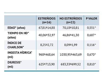De los pacientes que presentaban estreñimiento objetivo: un 56% (n=9) eran mujeres, con una edad media de 67,81± 14,88 años, un tiempo medio en HD de 40,06±32,97 meses y un 25% presentó una diuresis <100 ml/24h. El 50% eran diabéticos (n=8); el 12% (n=2) tenían pautados opioides, el 44% (n=7) quelantes del fósforo, el 56% (n=9) hierro intravenoso intradiálisis y un 25% (n=4) laxantes. La comparación de las variables más relevantes entre pacientes con y sin estreñimiento, según Criterios Roma IV (2016), se representan en las tablas 1 y 2.