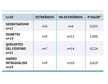 En cuanto a la comorbilidad, 19 pacientes eran diabéticos (50%), 16 hipertensos (42%) y 9 (24%) padecía alguna patología gastrointestinal, con una media de 8,15±2,29 puntos, en el Índice de Charlson. En relación al consumo de fármacos, 21 pacientes (55%) tenían pautados quelantes del fósforo y 19 pacientes (50%) se le administraba hierro intravenoso intradiálisis.