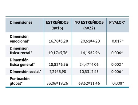 La puntuación media de calidad de vida obtenida mediante el cuestionario CVE-20 fue de 69,62±11,46 puntos en pacientes sin estreñimiento y de 53,06±19,26 en los pacientes con estreñimiento; existiendo diferencias significativas en todas las dimensiones entre ambos grupos (ver tabla 3).
