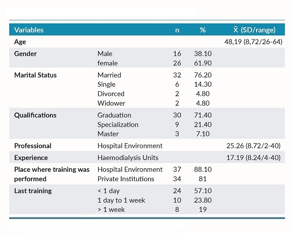 Concerning professional activity, by analysing table 1, we discovered that the aver-age number of years of professional experience in a hospital environment was 25.26 years (SD=8.72). Regarding the number of years of professional experience in HD units, the average was 17.19 years (SD=8.24).