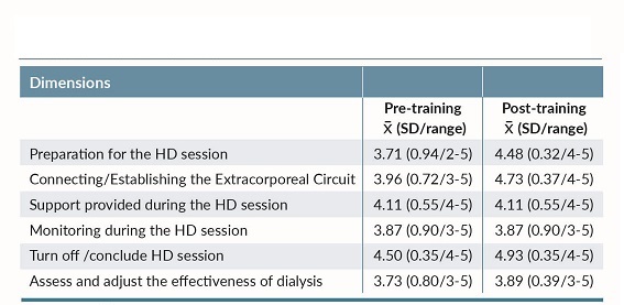 In the “preparation for the HD session”, “connecting/establishing the extracorporeal circuit” and “evaluate and adjust the effectiveness of dialysis” dimensions, there was an increase in average values in the pre-training to post-training. Regarding the remaining dimensions, the average values remained unchanged. There was no decrease in any dimension.