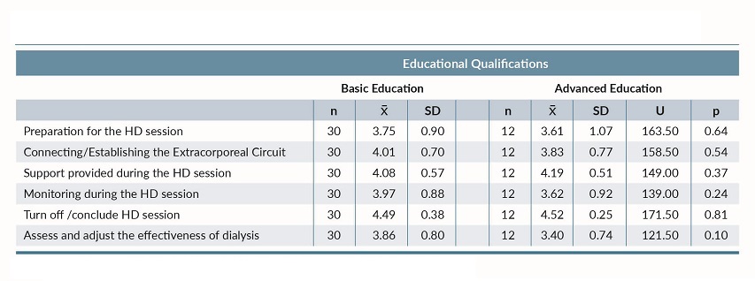We recoded the variable qualifications into two categories: basic education (includes bachelor’s and teaching) and advanced education (includes specialization, post-graduation, master and PhD). Thus, we crossed these two new categories with the competence of the Dialysis Nurse, through the Man-Whitney U test. The data in table 3 reveal that there are no statistically significant differences (p>0.05). Thus, there is no evidence to affirm that educational qualifications influence the perception of competence of Dialysis Nurses.