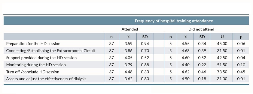 Regarding influence of the frequency of training actions on the perception of dialysis nurses’ skills, we discovered that there are statistically significant differences between the frequency of training activities in the area of HD in the hospital service where nurses work and the skills “connect/establish the extracorporeal circuit”, “support provided to the person during the HD session” and “evaluate and adjust the effectiveness of dialysis”.