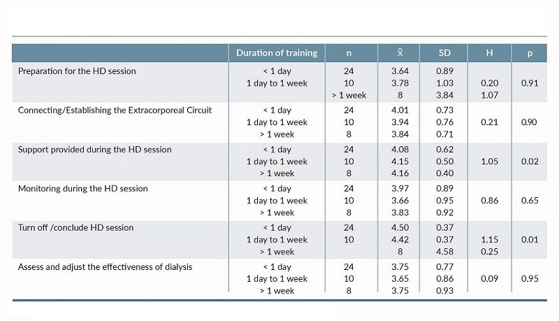 There is a significant influence of the duration of training actions on the perception of competence of the Dialysis Nurse. Therefore, we verified that there are statistically significant differences between groups (table 5), in the dimensions “support provided during the HD session” (H=1.05; p=0.02) and “turning off/completing the HD session” (H=1.15; p=0.01). Participants who performed training sessions lasting more than a week showed a greater perception of competence in the aforementioned dimensions. In the remaining dimensions, there were no statistically significant differences (p>0.05) between the groups.