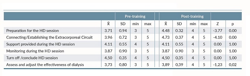 Regarding effectiveness of the training program on hemodialysis techniques, we found out that the Nurses showed an improvement in the perception of competence in terms of the dimensions of “preparation for the HD session”, “connecting/establishing the extracorporeal circuit” and “evaluating and adjusting the effectiveness of dialysis”.