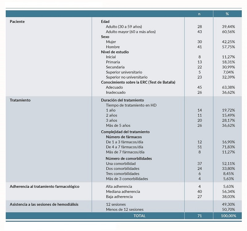 Del total de pacientes encuestados, el 60,56% (n=43) eran adultos mayores, siendo un 57,75%, (n=41) hombres y un 32,39% (n=23) poseían estudios superiores no universitarios. En cuanto al conocimiento sobre la enfermedad renal crónica, el 63,38%, (n=45) de los pacientes mostraron un conocimiento adecuado. El 52,11% (n=37) de la muestra presentaba al menos 1 comorbilidad, el 63,38%, (n=45) llevaba menos de 5 años de tratamiento de HD y un 71,83%, (n=51) consumía de 4 a 7 fármacos/día. El 56,34% (n=40) tenían una adherencia mediana al tratamiento farmacológico, y el 49,30% de los pacientes asistió a las 12 sesiones de hemodiálisis del mes (ver tabla 1).