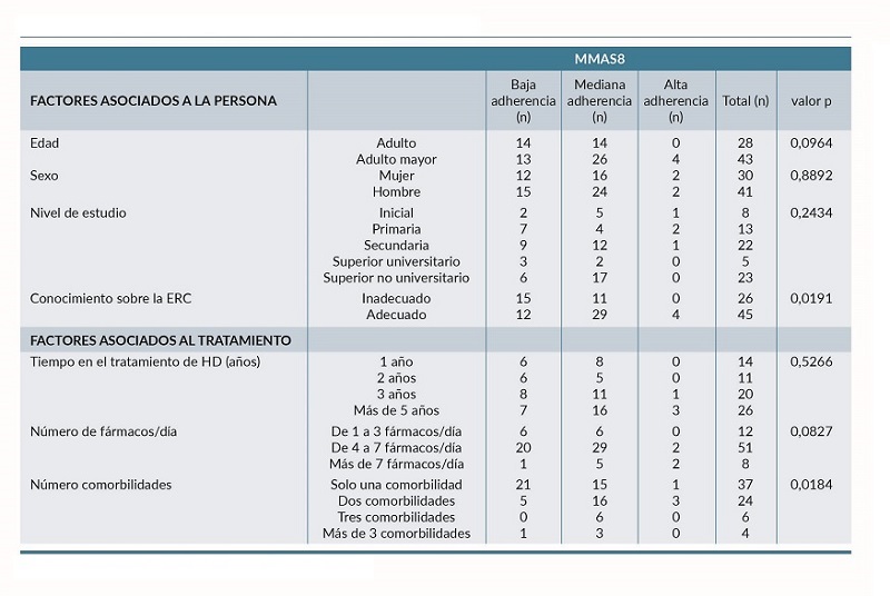 En la tabla 2 se puede observar que, respecto a los factores asociados a la adherencia al tratamiento farmacológico. fueron significativos el conocimiento sobre la ERC (p=0,0191) y el número de comorbilidades (p=0,0184).