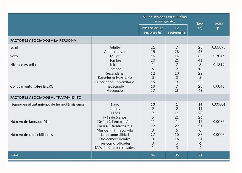 En la tabla 3, se muestra que los factores asociados a la adherencia a las sesiones de hemodiálisis fueron la edad (p=0,00095) y el conocimiento sobre la ERC (p=0,0041), el tiempo en el tratamiento de hemodiálisis (p=0,00001), el número de fármacos/día (p=0,0075) y número de comorbilidades (p=0,0005).