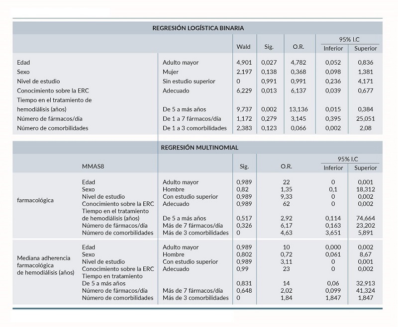 En la tabla 4, se puede observar en cuanto a la edad, que el ser adulto mayor tiene 4,782 (IC 0,052-0,836) mayor probabilidad de cumplir con las 12 sesiones de hemodiálisis en el mes. El tener un conocimiento adecuado sobre la ERC tiene 6,137 (IC 0,039-0,677) veces mayor probabilidad de cumplir con las 12 sesiones de HD al mes. Para el tiempo en el tratamiento de HD, el tener de 5 o más años en el tratamiento tiene 13,136 veces mayor probabilidad de cumplir con las 12 sesiones de HD mensuales. En la regresión multinomial e independientemente de la edad, sexo, nivel de estudio, conocimiento sobre ERC, tiempo en el tratamiento de HD y número de fármacos al día, los que tienen más de tres comorbilidades presentan 4,63 veces mayor probabilidad de tener una baja adherencia farmacológica, y 1,84 veces mayor probabilidad de tener mediana adherencia farmacológica.