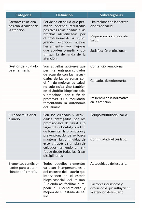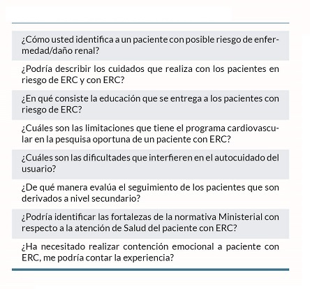 Se entrevistó a 10 profesionales de enfermería, los cuales reconocieron importantes elementos que tenían relación con el cuidado en los pacientes renales, resultando 4 categorías: 1. Factores relacionados con la calidad de la atención, 2. Gestión del cuidado de enfermería, 3. Cuidado multidisciplinario y 4. Elementos condicionantes para la atención de enfermería.