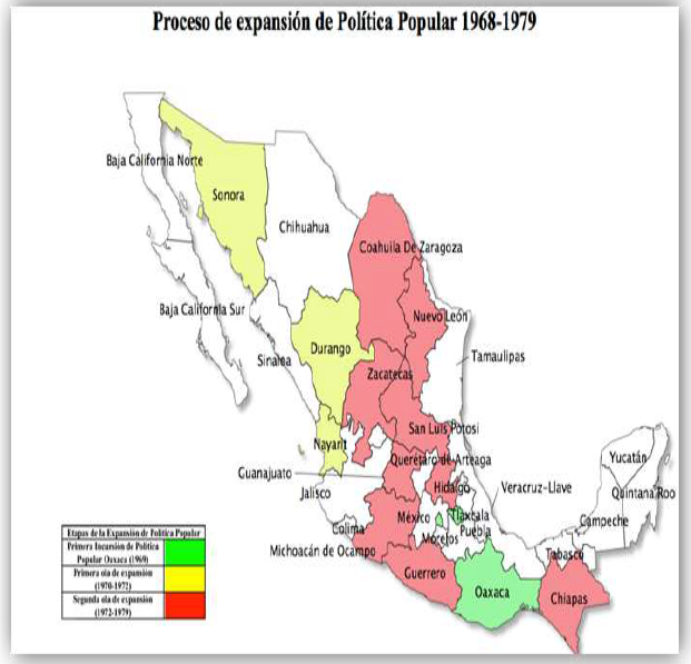 Sin embargo, este comienzo funcionó como base de futuras incursiones. Luego de reunirse en Tacámbaro, Michoacán en 1969, decidieron ir a zonas rurales del norte (Nayarit, Durango, y Sonora [amarillo]) para después extenderse a otras regiones (San Luis Potosí, Coahuila, Chihuahua, Zacatecas, Hidalgo, Michoacán [Lázaro Cárdenas], Querétaro, Chiapas, Sonora y Guerrero [rojo]). Fue esta segunda oleada la que sentó los cimientos para la extensión de su modelo organizativo y su posterior auge en las coordinadoras populares de finales de los años setenta y principios de los años ochenta. El siguiente mapa muestra el proceso de expansión de Política Popular del que trata este artículo.