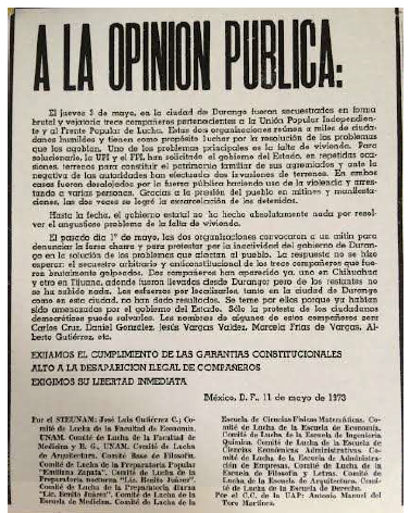Esta estrategia evolucionó a la invasión de terrenos para fundar nuevas colonias controladas por militantes de Política Popular. El 9 de febrero y el 8 de marzo de 1973 inquilinos de las vecindades de Durango intentaron posesionarse de terrenos que eran propiedad del gobierno estatal. Sin embargo, la violenta reacción de la policía estatal los forzó a retirarse e incluso algunos de los brigadistas fueron encarcelados.12 La espiral represiva del gobierno estatal desembocó en el secuestro de los brigadistas por agentes judiciales en abril y su consecuente expulsión de Durango, así como la detención de Jesús Vargas y Marcela Frías en el campo militar número 1 de la ciudad de México por dos meses. La campaña para lograr su liberación involucró manifestaciones en Durango y Chihuahua, así como desplegados en periódicos de la capital y una carta de José Revueltas pidiendo su libertad.13 El grado de solidaridad de la izquierda estudiantil de la ciudad de México con la lucha de los colonos en Durango y la demanda por la libertad de los detenidos se refleja en el siguiente desplegado publicado en Excélsior en mayo de 1973: