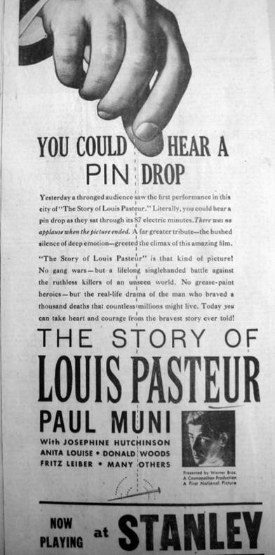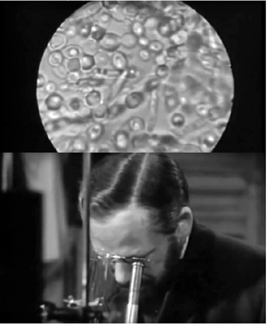 En cuanto a la publicidad de la película llama la atención cómo se buscó presentar este biopic como un género nuevo que no por narrar la vida de un científico era menos atractiva en su trama. Un anuncio daba cuenta que la tensión del público era tal que podía escucharse hasta el sonido de un alfiler cayendo en el suelo (Foto 1). Este comentario que resulta exagerado, no lo fue en el momento de su estreno pues tuvo buena acogida gracias a un guión que presentaba de forma ágil lo que puede considerarse uno de los primeros biopics centrados en científicos20 y en los microbios.21 Hay que recordar que durante la exhibición de la película, los públicos pudieron contemplar no solamente la escena donde Pasteur miraba a través de un microscopio, sino que también miraron lo que supuestamente el científico observaba: una toma micrográfica de dichos seres vivos revueltos y aumentados al tamaño de la pantalla de proyección (Fotos 2 y 3). También los espectadores pudieron contemplar al matrimonio de Louis y Marie Pasteur, quienes acostados reposaban en su cuarto no en una misma cama, sino en dos individuales. Una escena que hablaba no tanto de la higiene que pedía Pasteur a los médicos, sino del Código Hays que impedía escenas de una pareja metida en el mismo lecho.