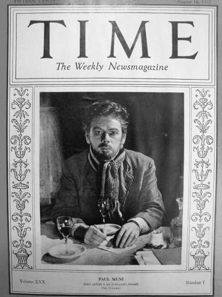 Otra imagen retórica próxima al símil es la del desplazamiento en el cual el adjetivo recae, dentro de la frase, no sobre el sustantivo natural sino en otro elemento más. Bajo esta óptica, en la película The Life of Emile Zola (1937), el traslado provenía de la actuación de Muni que ejecutaba el papel del novelista francés y no el de Dreyfus que sería el “natural” por tratarse de aquel oficial francés de origen judío acusado de espionaje.38 Desde luego, este razonamiento perdería sentido, en primer término, si no se considera que era un biopic cuyo centro es Zola y no el militar denostado. Pero, en segundo término, está el hecho de que Muni también era la estrella del momento por lo cual su llamado a interpretar el papel protagónico resultaba lo razonable. De hecho Muni, en la vida real, iba a tener un papel importante como patriota solidario para denunciar, desde los Estados Unidos, los atropellos al que estaban siendo sujetos los judíos. En todo caso, en el campo del arte cinematográfico es natural el desplazamiento: para los buenos actores no existen fronteras, por ejemplo, de etnia o religión. Pero en ese momento de persecución antisemita, encarnar al autor francés Zola, le permitía a Muni no solamente tener el rol estelar sino incluso defender a sus hermanos de sangre.39Este hecho no pasó desapercibido para la revista Time que destacó a Paul Muni en una de sus portadas de 1937 (Foto 6).40