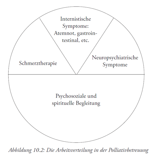 En lo que sigue sólo queremos considerar uno de los aspectos que Borasio expone en sus reflexiones sobre los cuidados paliativos. Se trata de la dimensión espiritual de la medicina en el terreno de la fase terminal de la vida humana. El autor remite a una instancia de la Sociedad Alemana de Medicina Paliativa, que ofrece una definición amplia de espiritualidad: se trata de la actitud interna, del espíritu interior, así como de la búsqueda personal de sentido por parte del ser humano, mediante lo cual él intenta confrontarse con experiencias de vida y, en particular, con amenazas existenciales (Borasio, 2015: 90).3 Pues bien, en lo relativo a la división del trabajo en el ámbito de los cuidados paliativos a los moribundos -lo que también incluye el cuidado de los parientes más cercanos-, Borasio destaca que el 50% de dicha actividad corresponde precisamente al acompañamiento psico-social y espiritual (Borasio, 2015: 185). He aquí el cuadro que propone: