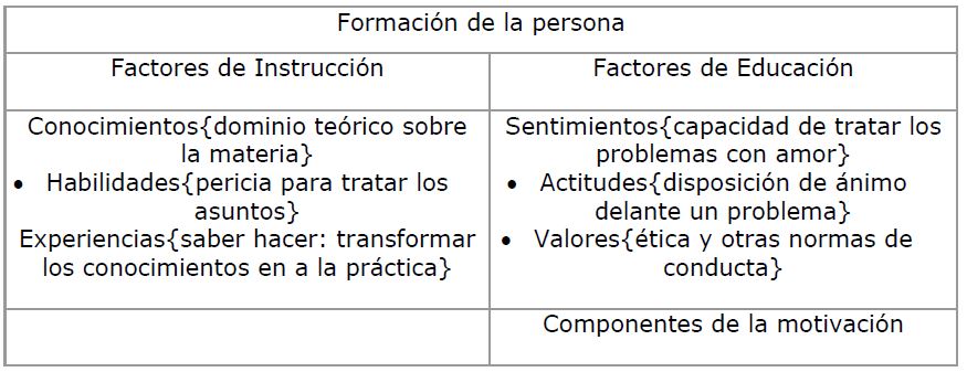 De acuerdo con el diccionario de la lengua española, el término competencia, presenta varios significados tales como: atribución, área de actividad, responsabilidad,etc., pero el concepto a que nos referimos en este punto añade un sentido holístico de profundo significado [2-5],que incluye: los sentimientos, pensamientos y valores del hombre que juntamente con los conocimientos, capacidades y habilidades mueven una acción en dirección a una tarea para alcanzar la meta u objetivodeseado. Según Sandoval [6], la contribución de los factores de educación para el cumplimiento de estos objetivos corporativos depende del factor motivación, como refleja la tabla 1.
