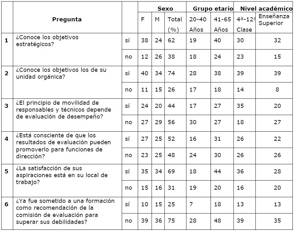 En este punto particular, y tal como se refleja en la tabla 2, 35 técnicos superiores (número correspondiente a un 56 %) indicaron que la movilidad y nominación para funciones en la Asamblea Nacional no ocurre mediante los resultados de la evaluación del desempeño, sino por otros factores y cerca de 54% no acreditan que con su dedicación, desempeño y profesionalismo alcancen la autorrealización profesional, económica y política dentro de la institución. Este sentimiento de los técnicos puede afectar las motivaciones, y según Abraham Maslow las motivaciones humanas atienden a una jerarquía de cinco necesidades y la más grande es la autorrealización que puede ser económica, social y política [3,6,7].