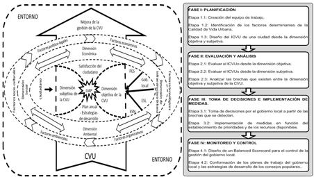 La CVU se expresa en dos dimensiones: la objetiva y la subjetiva que condicionan ambas el bienestar de las personas en un determinado entorno [8]y se evalúa a partir del establecimiento de indicadores que refieren, tanto una visión cuantitativa (objetiva y que refleja la realidad) como otra basada en la percepción y las características del sujeto (ciudadano) en relación con su nivel de vida, con el objetivo de satisfacer las necesidades sociales y de trazar políticas territoriales y urbanas. O sea, son los gobiernos locales los actores encargados de formular dichas políticas, basadas en un modelo de gestión con el que pretenden alcanzar sus objetivos estratégicos[15,16].