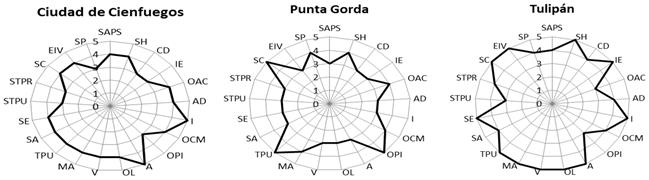 En este paso se realiza el procesamiento estadístico de los resultados de la aplicación del instrumento, tanto a nivel de cada consejo popular como de la ciudad en general. Se pudo determinar, como es lógico pensar, que existen diferencias con respecto a la percepción de los ciudadanos sobre su CV y que cambian según el lugar donde residen. En la figura 2 se muestran los resultados obtenidos de este procesamiento estadístico en una hoja Excel, respecto a los valores de la escala Likert utilizada, diagramados en gráficos tipo radar, para la ciudad de Cienfuegos y a modo de ejemplo para dos de sus consejos populares involucrados en el estudio.
