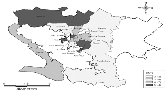A modo de ejemplo, se muestra el mapa confeccionado utilizando el software MAPINFO versión 8.5 para mostrar los resultados de la percepción ciudadana de los 17 consejos populares estudiados en la variable de servicios de atención primaria de salud (SAPS) (figura 3). El empleo de este software permite la visualización de la información a través de mapas, facilitando la consulta de datos específicos con rapidez y desde diferentes puntos, representando una ayuda para apoyar los procesos decisorios asociados a una variable específica en las diferentes áreas que se analizan, además de encontrar terrenos adecuados para el desarrollo.