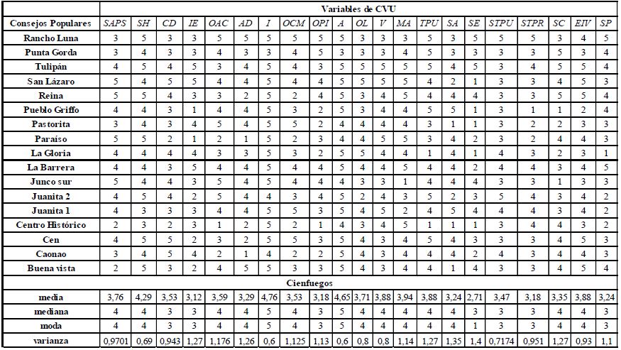El análisis de los resultados de la evaluación de la CVU percibida por los ciudadanos del municipio de Cienfuegos en general, evidencia que los factores determinantes en la CVU son: el ingreso de las personas (I) y la alimentación (A), con valores de moda y mediana de 5 (tabla 2). Los factores que influyen en mayor medida evaluados con un valor de moda igual a 4 son: los servicios de atención primaria de salud, el servicio hospitalario, la oferta artística cultural, las actividades deportivas, las ofertas del comercio minorista, la ocupación laboral, la vivienda, el medio ambiente, el transporte público urbano, el servicio de agua, el servicio de electricidad, los servicios comunales y el estado de la infraestructura vial. Todos los demás aspectos como la seguridad pública, los servicios de telefonía pública y privada, la oferta de productos industriales, la infraestructura educativa y la calidad de la docencia son evaluados con una moda de 3,o sea, influyen también en la CVU, pero en un menor grado de percepción que las demás.