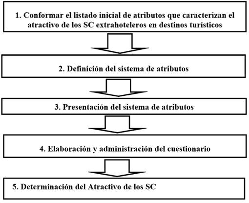 En la determinación del atractivo de los SC extrahoteleros en destinos turísticos se propone trabajar con el procedimiento específico que se muestra en la figura 1. Mediante este procedimiento se logra operacionalizar el término Atractivo, y se determina los atributos que lo conforman y vías para medirlo.
