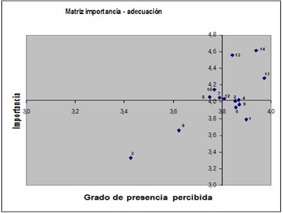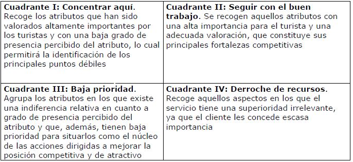 Esta matriz es un procedimiento que muestra la importancia relativa de varios atributos y su grado de presencia percibida. De esta manera, la utilización de un análisis de este tipo puede ser de gran ayuda para los responsables de la gestión turística, ya que facilita la identificación de aspectos o atributos a los cuales se les debe dedicar una mayor atención, asignándoles más recursos y programas para mejorar.
