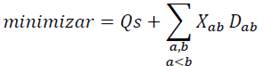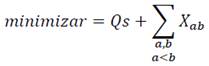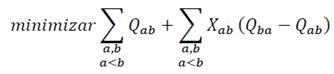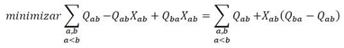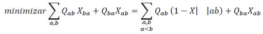 De esta manera, ahora el problema quedaría planteado solo en términos de las variables Xab tales que a<b. La función objetivo podría transformarse de la forma siguiente expresada en las ecuaciones 20, 21, 22: