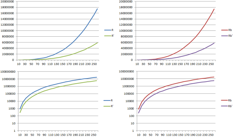 La figura 1 muestra la gráfica comparativa del crecimiento de R vs R’ (izquierda) y de Rb vs Rb’ (derecha). En la parte inferior de la figura 1 se muestran la misma información que en la parte superior, pero usando una escala logarítmica.