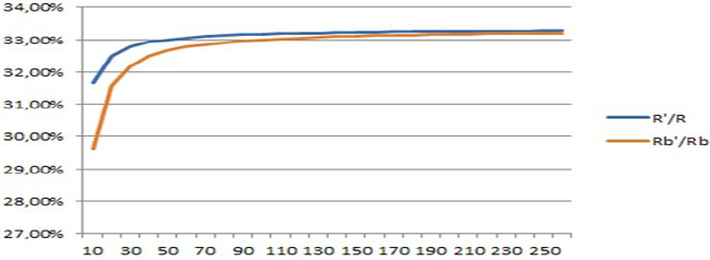 Para un análisis más detallado, la figura 2 muestra la proporción de la reducción en la nueva formulación según crece n, es decir los valores de R’/R y de Rb’/Rb.