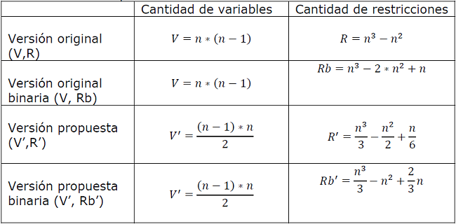 La tabla 1 muestra las fórmulas explicadas antes que se corresponden con la cantidad de variables y restricciones en las dos formulaciones del problema: la previa (V,R) y la nueva que se presenta (V’,R’). Adicionalmente se muestran las cantidades de restricciones obviando las restricciones que definen que las variables son binarias. Es decir, estás serían las cantidades de restricciones si se asume el problema como un problema de Programación Lineal Binaria [15].