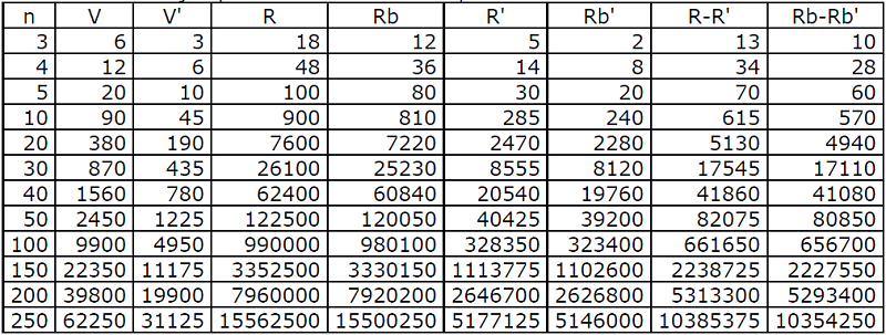 La tabla 3 muestra algunos ejemplos de V, V’, R, Rb, R’ y Rb’ para algunos valores de n.