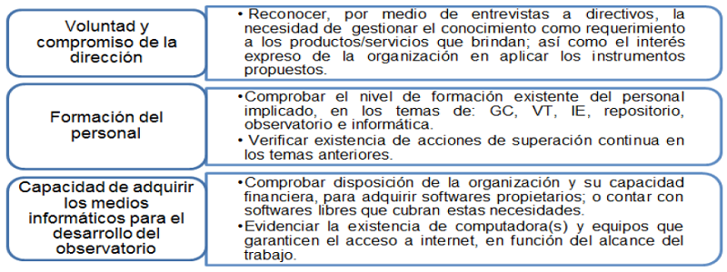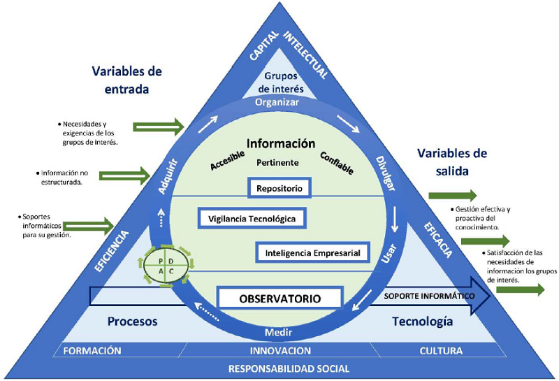 Se sustenta en La creación de un observatorio, con la integración de herramientas, tales como: repositorio, vigilancia tecnológica e inteligencia empresarial. Esto facilita que el público objetivo acceda a conocimiento útil, pertinente y confiable; lo emplee y llegue a formar parte de la cultura de La organización; lo contextualice, con responsabilidad social y se desarrolle el capital intelectual y La innovación.