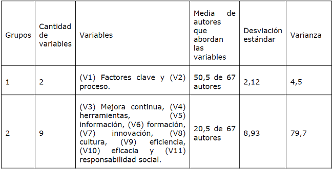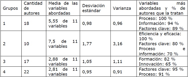 De los cuatro conglomerados de modelos de GC, en el grupo dos se encuentran los cinco modelos que más variables abordan de los 67 estudiados. En este grupo, los 10 autores contemplan las variables eficiencia y eficacia en sus modelos; ocho de ellos, los factores críticos y siete, los procesos y la información, por lo que se concluye que los modelos más representativos están enfocados en lograr la gestión efectiva del conocimiento.