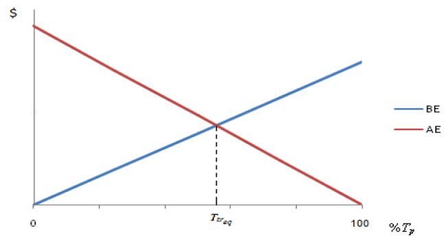 La relación entre el beneficio y la afectación económica se muestra en la Fig. 1. Al expresar AE en función de Ttr se puede constatar que a medida que aumenta el peso del tiempo trabajado en un periodo determinado, BE aumenta mientras que AE disminuye. Por tanto, existe un punto de equilibro en el cual BE = AE.
