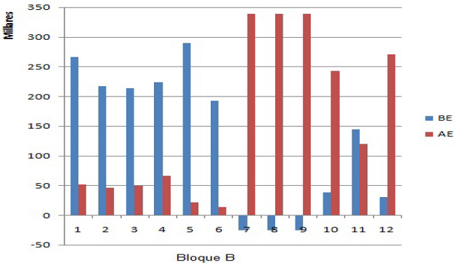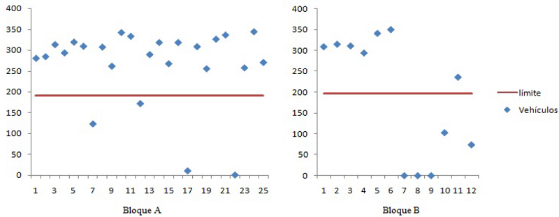Tanto en la figura 4 como la 5 es posible observar que para los vehículos 7, 17 y 22 del bloque A se cumple que BERij<AERij , mientras que para el bloque B esta condición se cumple en los vehículos 7, 8, 9, 10 y 12. Esta clasificación permite definir los vehículos que realmente se encuentran en situación de toma de decisión.