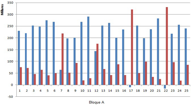 En las figuras 2 y 3 se pueden detectar además situaciones a nivel de flota. En el caso del bloque B, casi la mitad de los vehículos se encuentran por debajo del punto de equilibrio, lo que sugiere la presencia de un problema. El mismo puede estar dado por la diferencia de tecnología - factor relevante - ya que, bajo las mismas condiciones y entorno de trabajo (operación, carga, mantenimiento, entre otros) existe un comportamiento desigual del conjunto de vehículos.