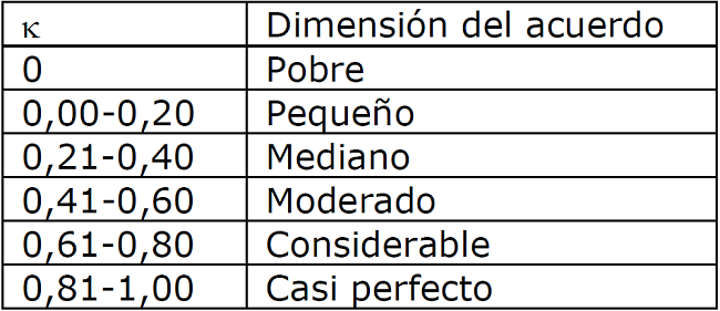 Esta clasificación se reconoce como arbitraria [25] pero es ampliamente aceptada [24]. No se encontraron estudios que definieran el límite de la fuerza del acuerdo para aceptar los métodos contrastados. Para los efectos de este trabajo se considerará que se acepta método propuesto si k> 0,61, lo cual significaría que el grado de acuerdo es considerablemente superior respecto al que podría esperarse debido al azar.