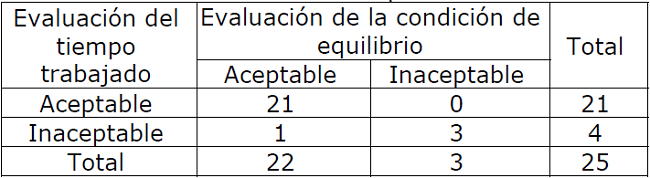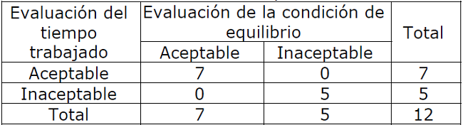 Todos los vehículos fueron evaluados por los métodos de la condición de equilibrio y el tiempo trabajado. Ambos métodos obtienen como resultado la clasificación de Aceptable e Inaceptable (ver Tabla 1). Las coincidencias en las clasificaciones obtenidas fue de un 96% para el Bloque A y 100% para el Bloque B. Las discrepancias en el estudio de toda la población fue de 2.7 %. La clasificación para los bloques A y B se resumen en la ¡Error! La autoreferencia al marcador no es válida. y Tabla 8, respectivamente.