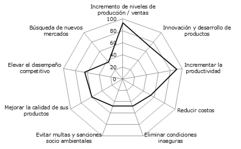 Se determinó que la mayoría de las empresas opta por adquirir nueva tecnología para el incremento de la producción, las ventas y la productividad. Dejando en segundo plano la innovación y el desarrollo de productos, el desempeño competitivo y la calidad de productos, servicios y costos. Entre los aspectos de menor interés por el empresariado están: adquirir tecnología para insertarse en nuevos mercados, evitar multas y sanciones socio-ambientales y eliminar condiciones inseguras que se refleja en un estancamiento de las PyMEs metalmecánicas ecuatorianas. Esto se observa en su comportamiento en algunos indicadores mundiales, tales como: el Índice de Competitividad (Global World Economic Forum, 2016) y el Índice Global de Innovación (WIPO et al., 2016). El primero ubica a Ecuador en el puesto 91 entre 138 países como uno de los más bajos de la región y el segundo en el puesto 100 entre 128 países [41,42]. Este comportamiento no ha presentado mejoras significativas en los últimos 5 años.