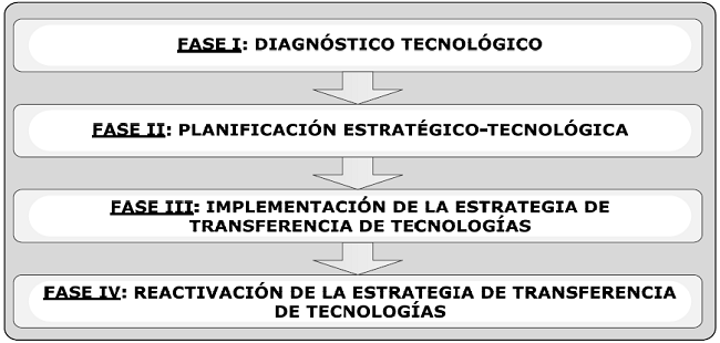 En la primera fase se realiza un diagnóstico tecnológico de la PyME que comprende dos momentos, uno orientado al análisis situacional interno / externo de la organización y otro centrado específicamente en la tecnología disponible. Una segunda fase denominada Planificación estratégico-tecnológica que culmina con el diseño y formulación de la estrategia de transferencia de tecnologías. La tercera fase se destina al proceso de implementación de la estrategia de transferencia de tecnologías, mediante la elaboración e implementación del plan anual de transferencia de tecnologías, su evaluación y la determinación de alternativas de habilitación / enriquecimiento que correspondan. La cuarta y última fase se dedica la reactivación de la estrategia de transferencia de tecnologías a partir de su control y mejora.
