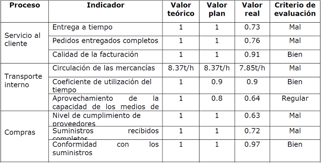 En la tabla 4 se resumen los resultados de la valoración del estado actual de los procesos logísticos. Al respecto se plantea que, si al menos un indicador es evaluado de mal, el proceso se considera no eficaz, por lo que se considera un proceso eficaz cuando todos sus indicadores se evalúan de bien o regular.
