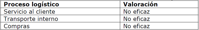 Al conjugar los resultados de las tablas 3 y 4 se puede observar que el proceso logístico de servicio al cliente tuvo una valoración de no eficaz debido a que los indicadores de entrega a tiempo y pedidos entregados completos están evaluados de mal. Esto se debe a que solamente el 73 % de los pedidos entregados son suministrados a tiempo y el 76 % entregados completos. El indicador de calidad de la facturación tiene un comportamiento aceptable del 91 % de las facturas emitidas perfectas.