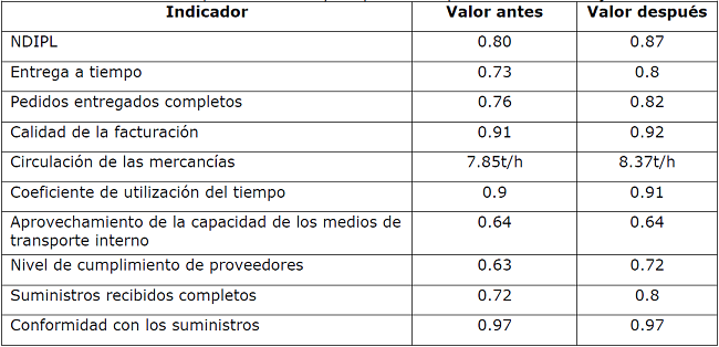En la tabla 5 se refleja que el indicador antes (NDIPLA) tiene un valor de 0.80 y después (NDIPLD) de 0.87 lo que demuestra un mejoramiento en el nivel de desempeño integral de los procesos logísticos tras la implementación de las medidas de mejora. En esta misma tabla se puede apreciar que el aprovechamiento de la capacidad de los medios de transporte interno y la conformidad con los suministros, se quedarán iguales. El resto de los indicadores aumentaron demostrando un mejoramiento en los mismos.
