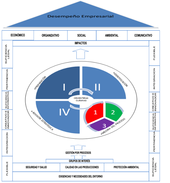 Sobre la base de esta concepción teórica se diseña el modelo conceptual de gestión y mejora de procesos con contribución a la integración de sistemas normalizados en las cementeras cubanas. Para los mercados actuales y bajo los retos que están sometidas las empresas, cualquier plan de mejora debe ser liderado con un enfoque sistémico. Por tanto, el modelo parte de las exigencias y necesidades que el entorno presenta, fundamentalmente encabezadas por la calidad en las producciones, la seguridad y salud de los trabajadores y la protección medioambiental, reflejadas en las exigencias de los distintos grupos de interés, que, con un enfoque a procesos, deben enmarcar las estrategias empresariales.