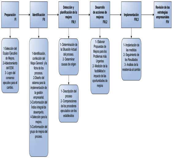 Se proponen cuatro fases, sobre la base del ciclo de mejora de Deming, I: Preparación, II: Identificación, III: Mejora del proceso y IV: Revisión estratégica. La Mejora del proceso se divide en tres etapas; I: Detección de oportunidades de mejora, II: Determinación de acciones de mejora y III: Implementación de las medidas. Esta fase tiene también un carácter cíclico, “gira” constantemente en función de la mejora continua de los procesos. En la fase IV se definirá si es necesario ejecutar nuevamente las dos primeras o solo “girará” la tercera fase.