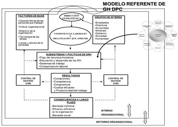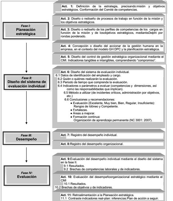 Ese accionar de la GRH, en esta contemporaneidad ha de responder a un conjunto de enfoques: estratégico, sistémico, interdisciplinario, transdiciplinar, participativo, proactivo, de proceso y de competencias laborales. El enfoque estratégico exige que todo el accionar de la GH se encamine a tributar a la estrategia y, en específico, a lograr que el desempeño individual tribute al desempeño estratégico organizacional, que es precisamente lo que se busca al concebir de manera ajustada u orgánica a la evaluación del desempeño. Y ese accionar se ubica en un modelo conceptual funcional de GRH, denominado GRH DPC (Figura 3).